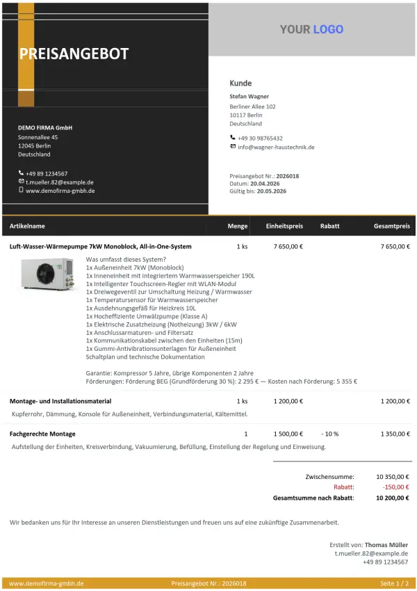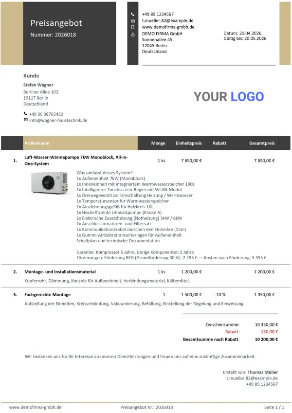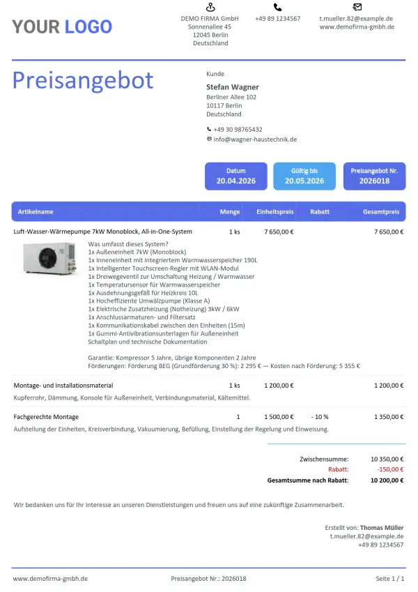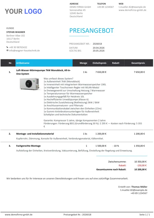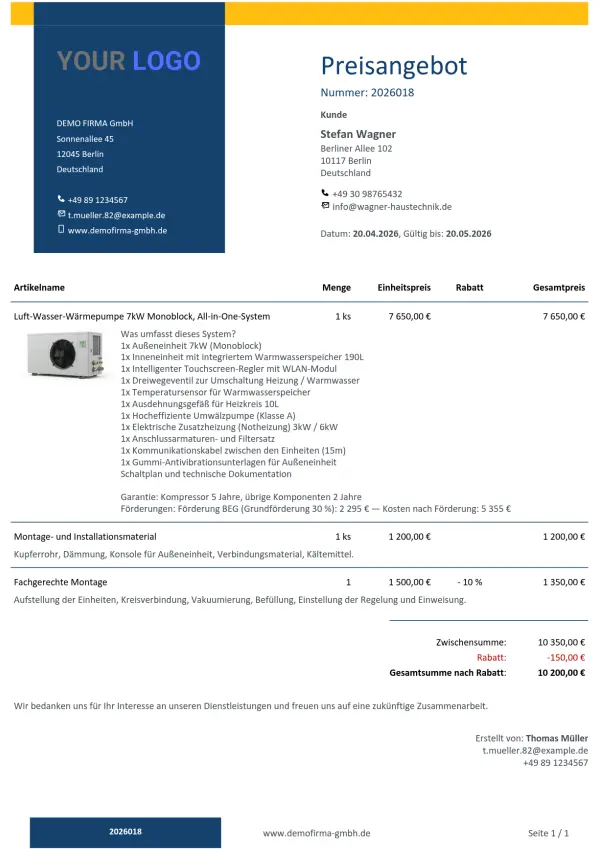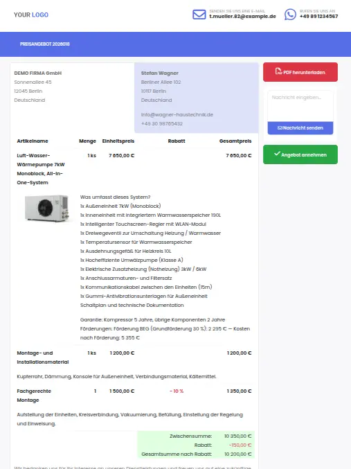 Ein Preisangebot für eine Wärmepumpe oder Photovoltaik enthält Dutzende Positionen – Material, Arbeit, Abnahme, Transport. Das interaktive Preisangebot präsentiert das dem Kunden übersichtlich auf einer Seite, ohne dass er sich in einem PDF-Anhang verliert.