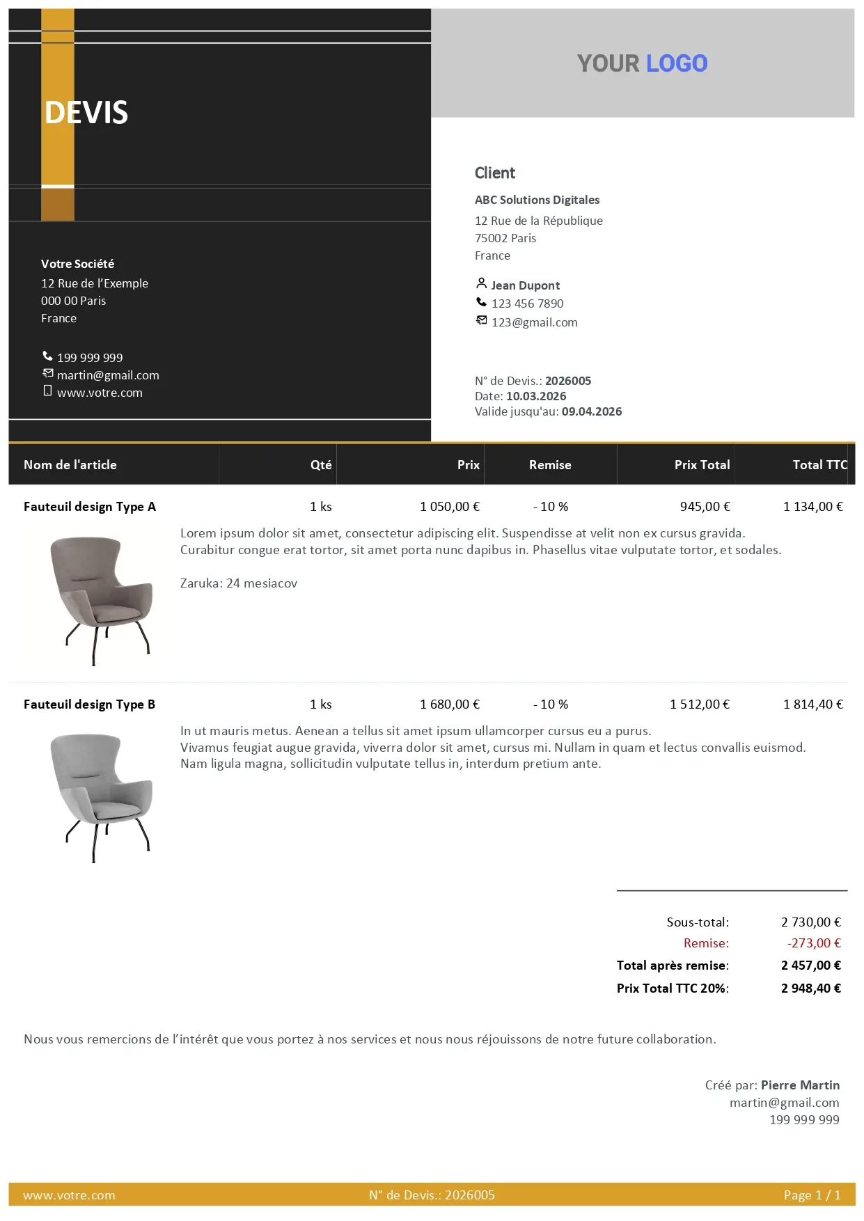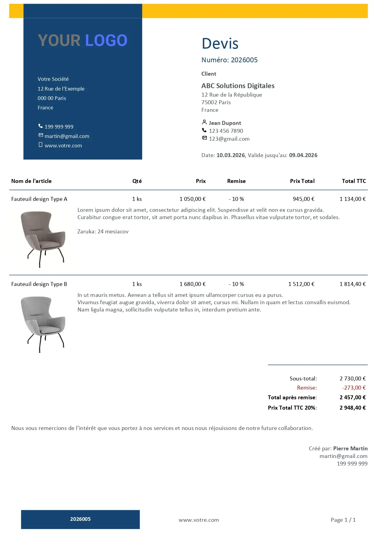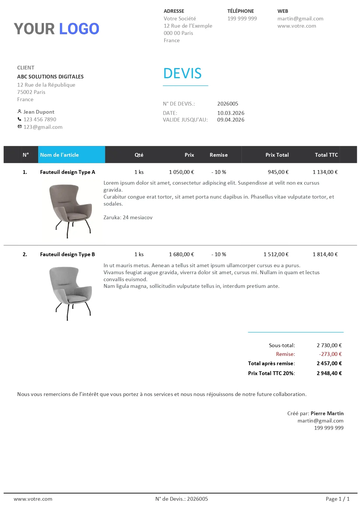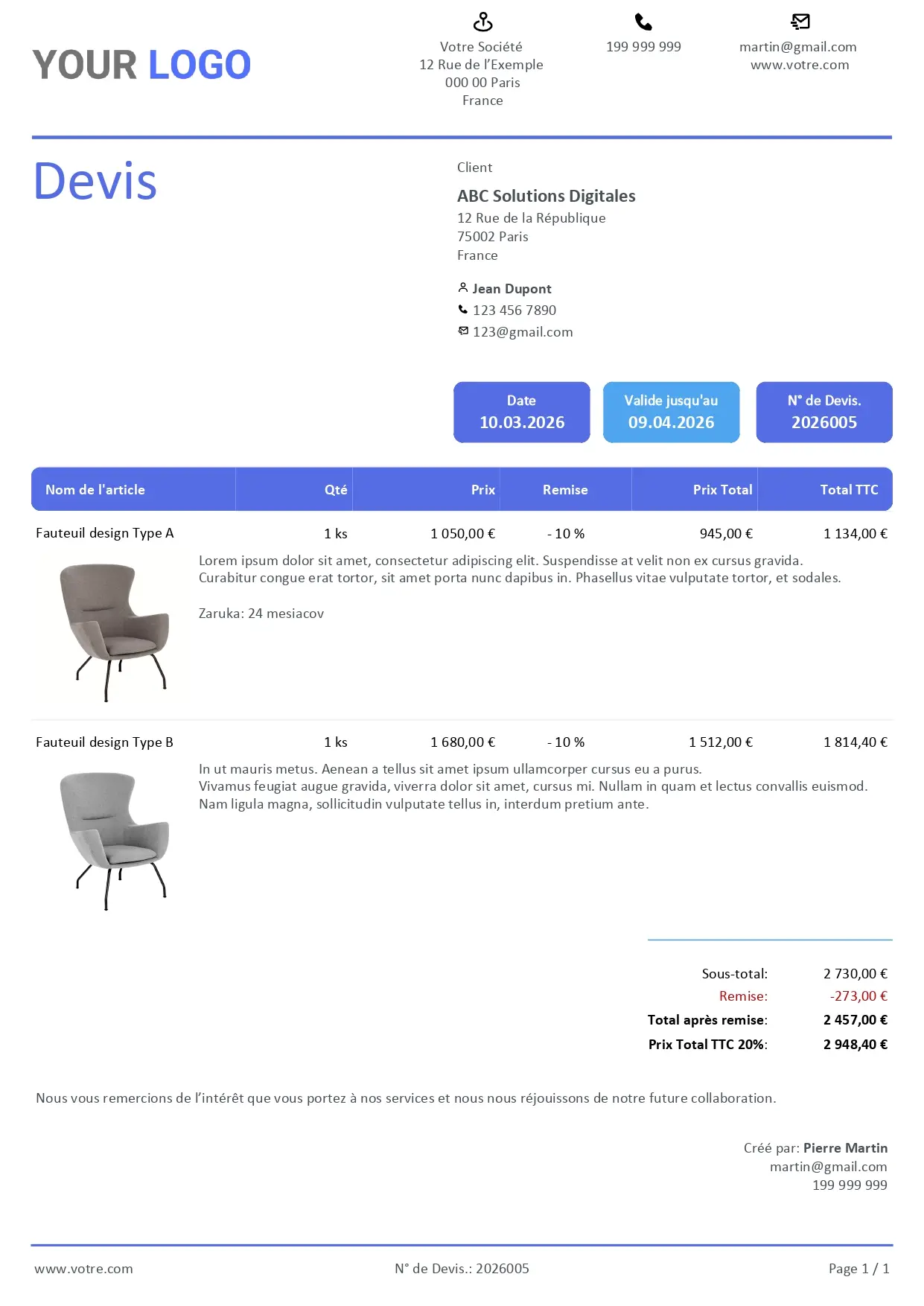 Choisissez un design moderne, personnalisez les couleurs et le logo, et envoyez le devis en PDF ou en version en ligne interactive que votre client peut commenter et approuver directement.