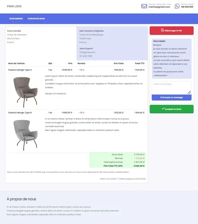 Un devis interactif transforme un PDF classique en une petite page web destinée uniquement à votre client. Il voit toutes les informations clairement au même endroit, peut télécharger le devis, consulter les détails, poser des questions et ... l’approuver directement.