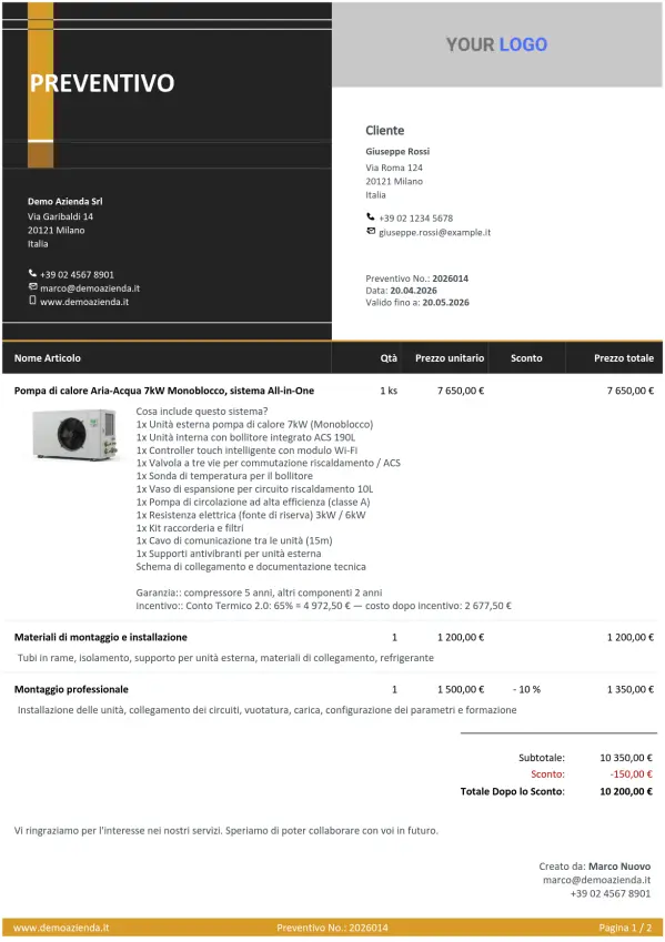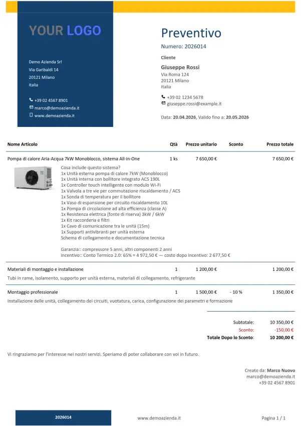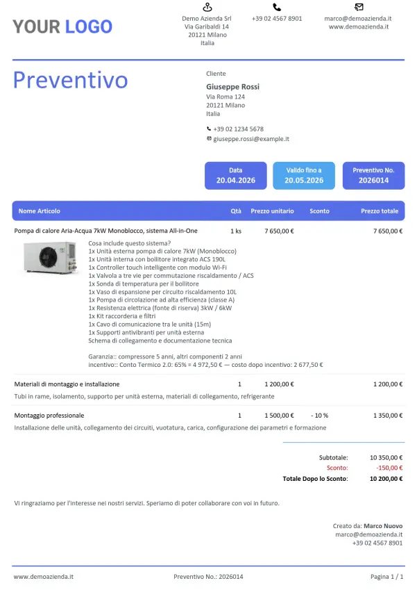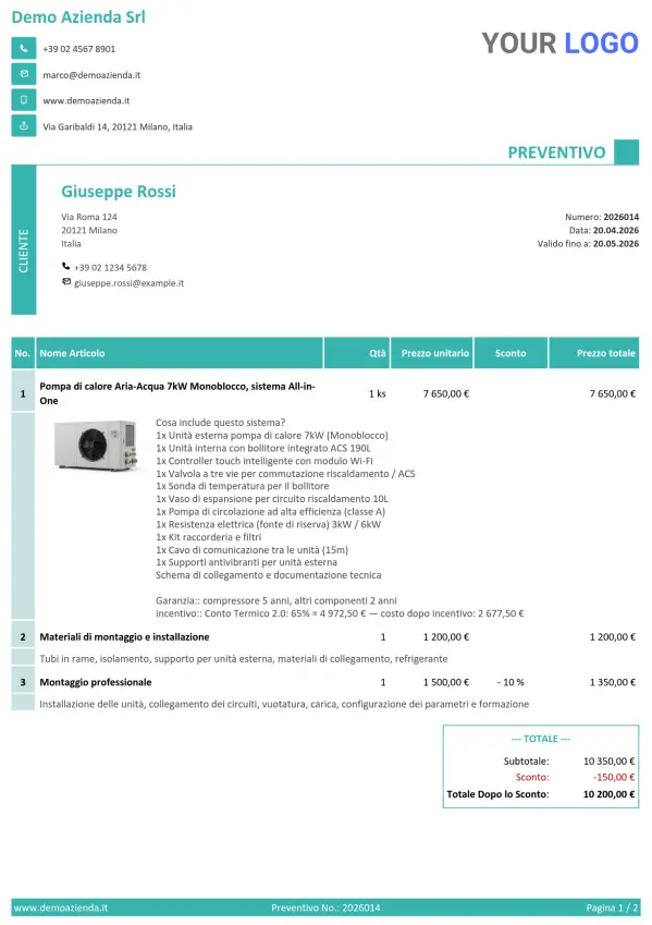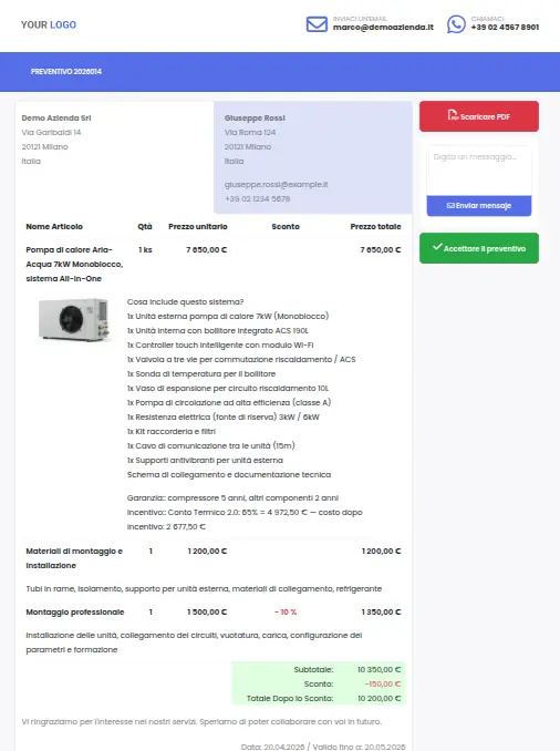 Un preventivo per una pompa di calore o un impianto fotovoltaico contiene decine di voci — materiali, manodopera, collaudo, trasporto. Il preventivo interattivo presenta tutto in modo chiaro su un'unica pagina, senza perdersi in allegati PDF.