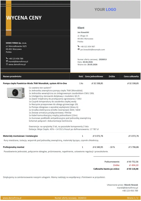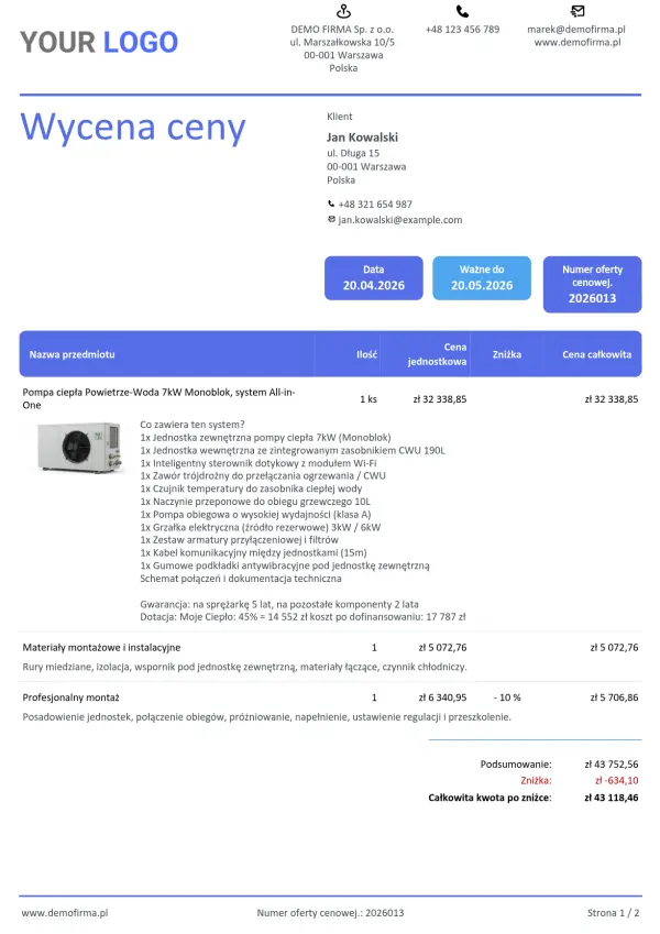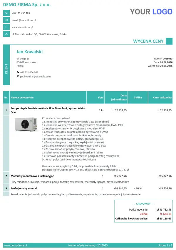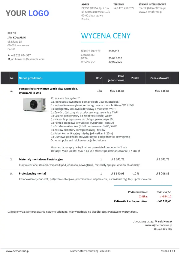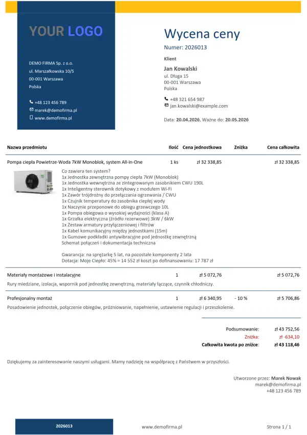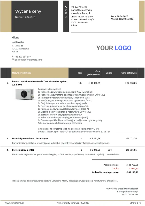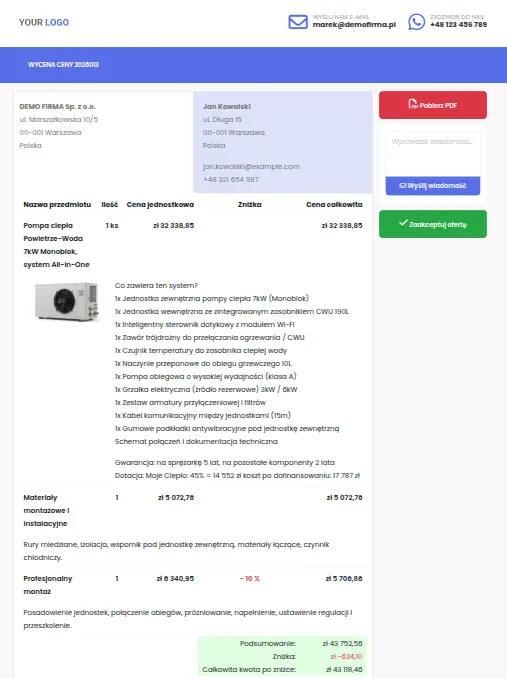 Oferta na pompę ciepła czy fotowoltaikę zawiera dziesiątki pozycji — materiały, robocizna, odbiór techniczny, transport. Interaktywna oferta przedstawia to klientowi przejrzyście na jednej stronie, bez gubienia się w załączniku PDF.